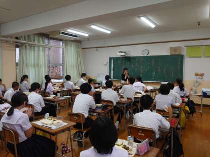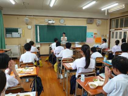4限の授業が終わり、楽しみな給食の時間が始まります。2年生の皆さんが配食の準備中。今日は「プルコギ・トック・枝豆」の韓国料理をいただきます。韓国では「秋夕(チュソク)」という祝日が今月末に近付いてきました。日本のお盆休みにあたるそうですよ。