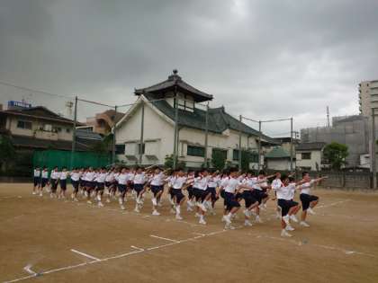 1年生体育の授業で体育大会の入場行進を練習中。大きく腕を振って元気良く行進します。前後や隣との間隔は、グラウンドに打ち込まれた色テープを参考にしてくださいね。体育科の先生方の準備がさっそく役立っています。