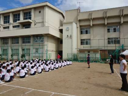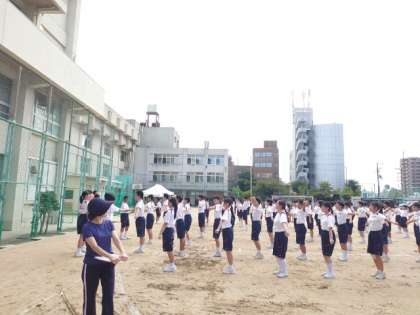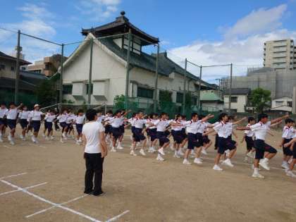 運動場で体育大会の学年練習が行われています。トップバッターは1年生。入場行進やラジオ体操を練習します。行進曲に合わせて腕をしっかり振って入場します。初々しさを感じる姿が微笑ましいですね。