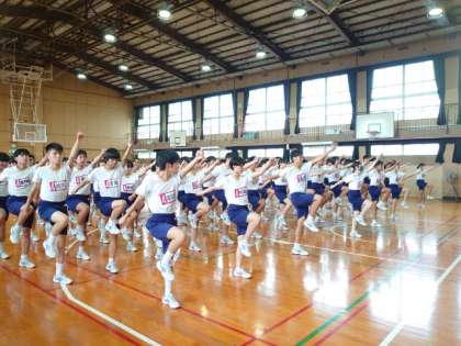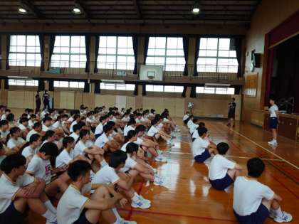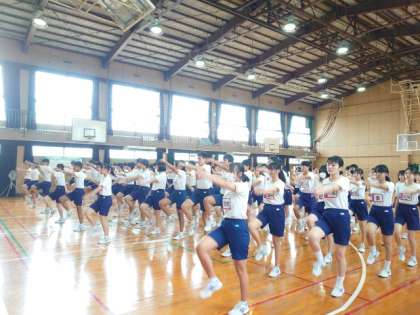 午後からは3年生が練習します。これからというタイミングで急に強いにわか雨が。急遽、体育館に集まって行進の練習から始めます。運動場が水浸しのため、今日は体育館での取り組みになりそうです。