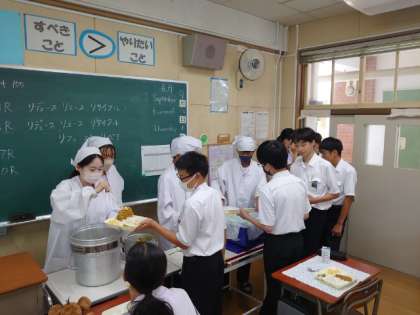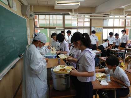 午前の授業が終わり、楽しみな給食の時間。1年生の皆さんが配食に大忙し。今日は「キーマカレー・キュウリのサラダ・洋梨」の人気メニュー。しっかりと煮込まれたカレーは美味しいですね。たくさんいただきましょう。