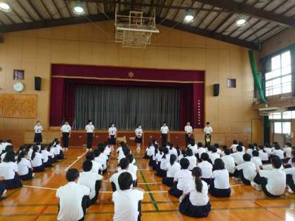 金曜の朝は3年生が学年集会を開きます。今朝は生徒会の各常任委員さんからお話がありました。「憧れの先輩として、より一層意識を高めよう」との呼びかけがありました。皆さんのきびきびとした行動や暖かい声かけが学校の雰囲気をより良くしてくれますね。