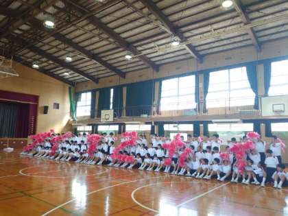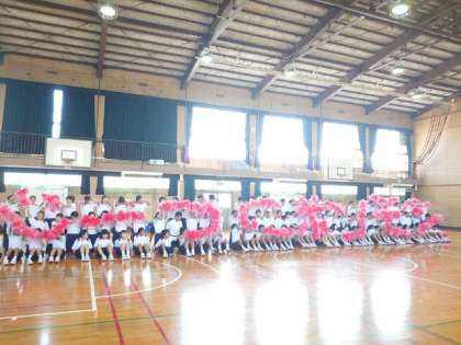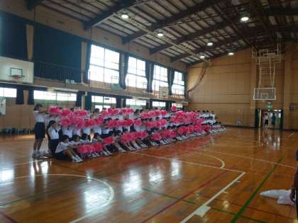 午後の気温上昇を受けて、合同練習を学年毎の練習に変更しました。体育館では1年生が学年演技の練習中。ポンポンで描く文字が読めるでしょうか?