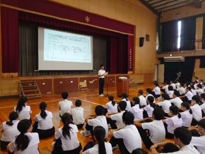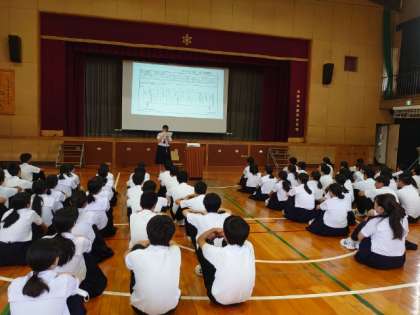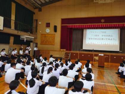 2年生の皆さんが体育館に集まり「職業調べ」の発表会を行っています。各クラスで選ばれた代表が、(夏休みに調べた)お仕事についてスピーチします。それぞれのお仕事の特色や、お仕事への想いがよく伝わる内容でしたね。