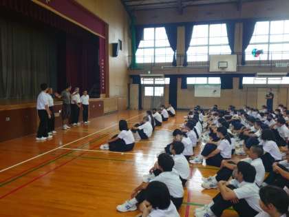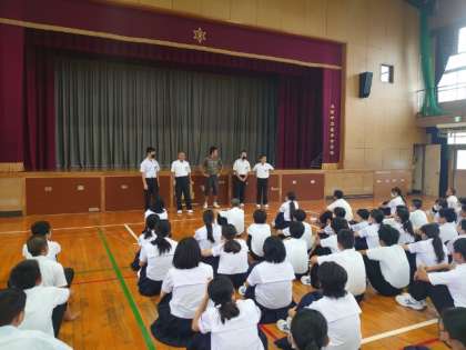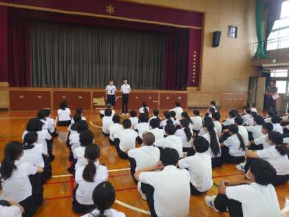水曜日の朝は1年学年集会の日。今朝は体育大会のプログラム「クラス対抗綱引き」の対戦相手を決めました。各クラスの体育委員さんが意気込みをお話語ります。優勝をめざしてどのクラスも頑張りましょう。
