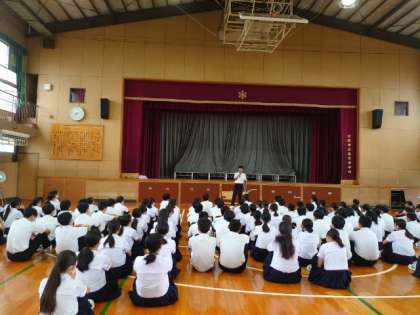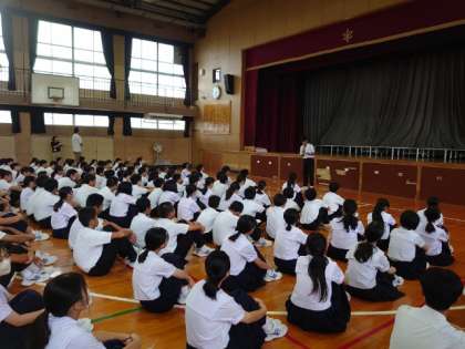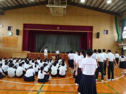 2年生の皆さんが学年集会を開いています。今日の3、4時間目に体育大会の学年練習を行う予定。委員長さんから学年演技のクオリティを高めようと、呼びかけがありました。実りある練習になりますように!