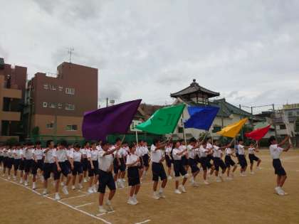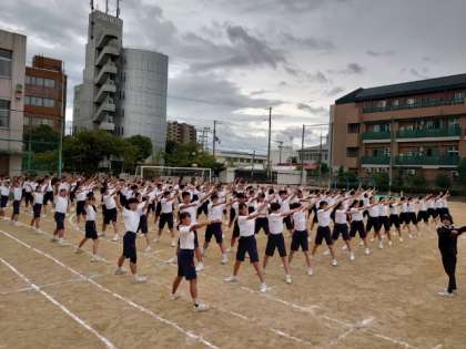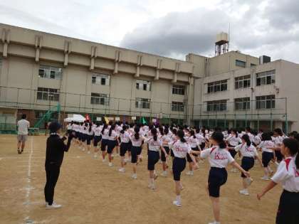 1年生に続いて2年生の皆さんが学年練習に取り組みます。軽快な楽曲に合わせて行進の練習から。縦横の列をぴったり合わせて行進するのは至難の技。お隣さんとの息を合わせて、集団の統一感を精一杯表現します。