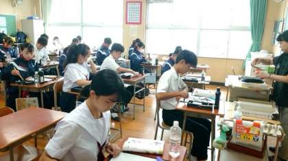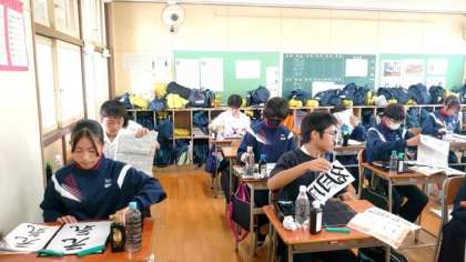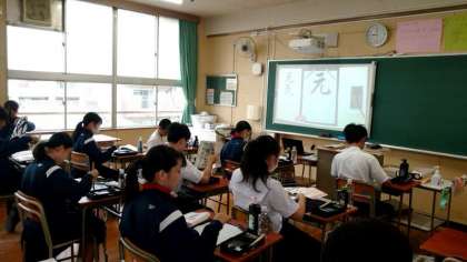 2年生国語の授業で書道に取り組みます。今日は毛筆の行書体を練習します。スクリーンに流れる書写の動画を参考に、皆さん静かに筆を運びます。しっとりした雰囲気が書道の学習にぴったりです。