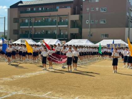 爽やかな秋空の下、第72回体育大会が始まりました。吹奏楽部の演奏に合わせて、皆さんが入場してきました。