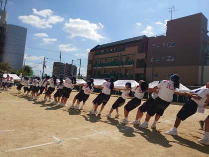 体育大会恒例のクラス対抗綱引き合戦。1年生の皆さんが懸命に綱を引きます。どのクラスも頑張ってください!