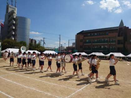 体育大会午後の部は部活動行進から始まります。最初は吹奏楽部・家庭科部・美術部が行進します。