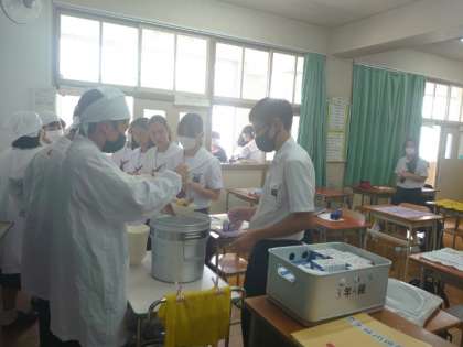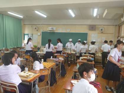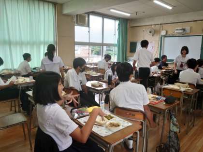 午前中の授業が終わり、お楽しみの給食の時間。3年生の教室では配食の真っ最中。今日は「豚のネギ醤油焼き・鶏と根菜の煮物・キュウリの甘酢づけ」の和風メニュー。和風出汁が香る煮物が美味しそうです。皆さんたくさんいただいてくださいね。