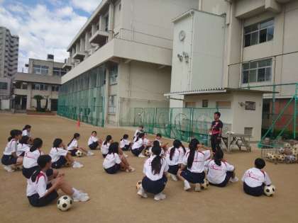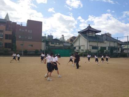 1年生女子体育の授業でサッカーの練習中。ペアになって攻撃・守備に分かれてボールを奪いあいます。ボールをコントロールするのが難しいですね。少しずつ練習を積み重ねていきましょう。