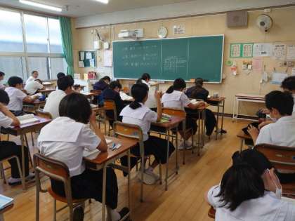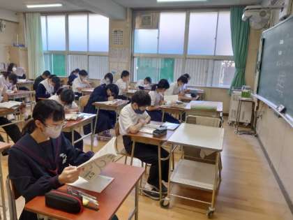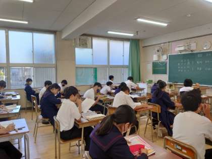 テスト開始前の1年生教室では、皆さんが学習内容の最終確認中。1時間目は数学のテスト。文字式の計算問題などが出るのでしょうか?うっかりミスの無いように気をつけましょう。