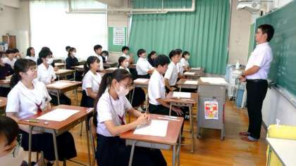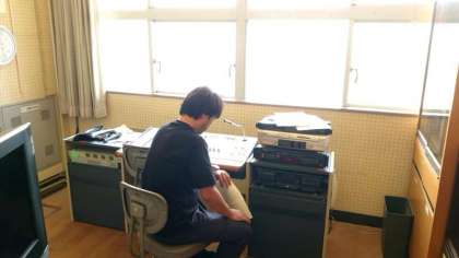 中間テスト1日目。最後は英語のテストです。3年生の皆さんがテスト開始のチャイムを待っています。放送室では英語科の先生がリスニングテストを流す準備をしています。テストが始まれば、3年用の問題を放送するそうです。3年生の皆さん、耳をすませて聞いてください。