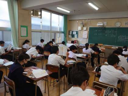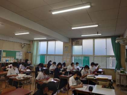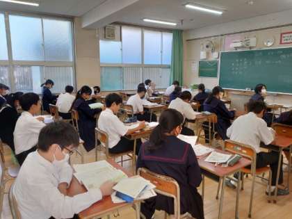 テスト開始前の1年生の教室ではまた皆さんが静かに勉強しています。1時間目は国語のテスト。文法や漢字のワークに目を通す人が多いようです。テストに出題されていれば良いですね。