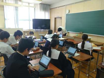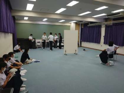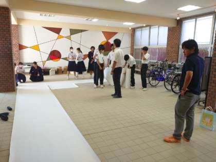 中間テストが終わり、各学年で文化祭に向けた活動が行われています。3年生は校内各所に分かれて創作劇の準備に取り組みます。役者さんは台本を元に演技の練習。音響チームはタブレット端末を駆使して効果音を探しています。玄関ピロティでは大道具チームが巨大背景を作ります。中学校生活最後の文化祭をみんなで盛り上げましょう。