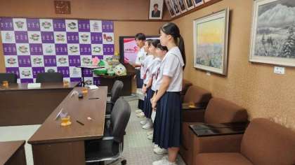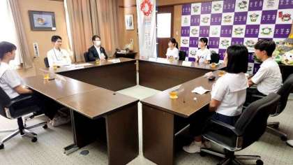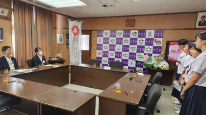 中間テストが終わった放課後、前期生徒会役員の皆さんが区役所を訪問し、区長さん・副区長さんと、SDGsなど、高津中で取り組んでいる生徒会活動についてお話しました。