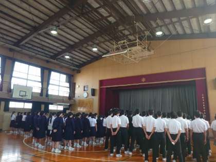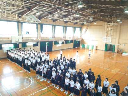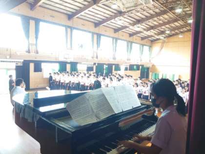 朝の学年集会で3年生の皆さんの歌声が聞こえてきました。文化祭の3年創作劇で歌うそうです。ピアノ伴奏に合わせて、美しいハーモニーが体育館に広がります。本番に向けてさらに磨きをかけましょう。