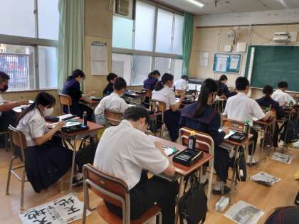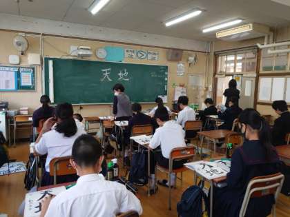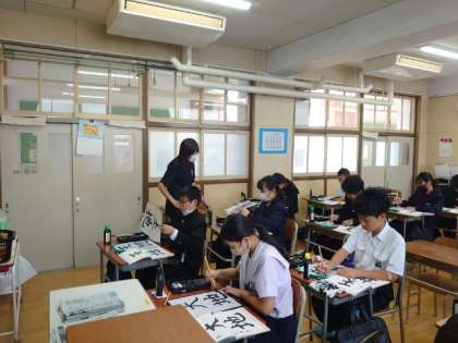 1年生国語の授業で書写 (毛筆)に取り組みます。「とめ・はね・はらい」を意識して、一文字ずつ丁寧に書いています。完成した作品は文化祭で展示するそうですよ。