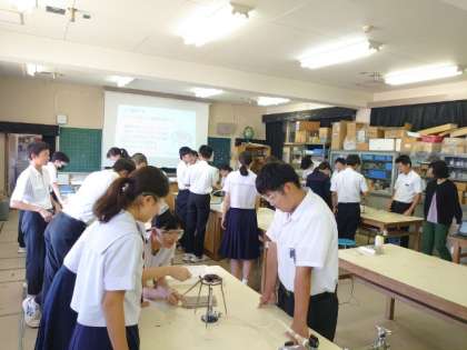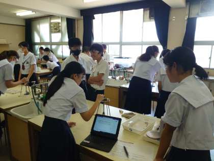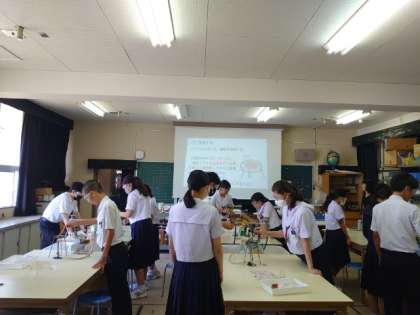 2年生の皆さんが理科室で実験中。銅の粉末を加熱して、質量の変化を調べます。銅と酸素が化合するので質量が変わるとのこと。赤褐色の銅粉がみるみるうちに真っ黒に。酸化銅というそうですよ。