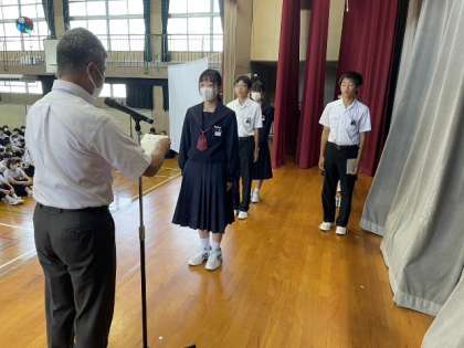 今朝の全校集会で、後期生徒会役員の皆さんに認証状を手渡しました。今後半年間、より豊かな学校生活に向けた取り組みを期待しています。また前期役員からこれまでの活動へお礼がありました。前期役員の皆さん、本当にありがとうございました!