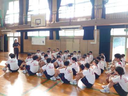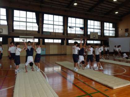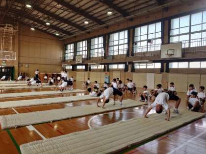 2年生男子体育でマット運動が始まりました。久しぶりの取り組みなので、まずはウォーミングアップから。仲間が補助に付いて、ゆっくりとスタートします。徐々に身体のバランス感覚を掴みましょう。