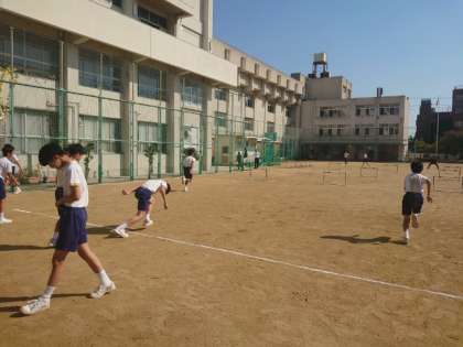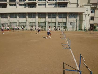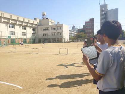 3年生男子体育でハードル走の練習中。今日はタブレット端末を使ってクラスメイトの走りを録画しています。ハードルを跳ぶ時のフォームを中心に、自身の課題を確かめます。実際の動きがイメージ通りになっていますか?