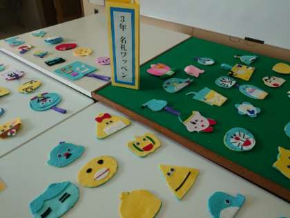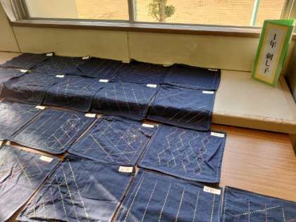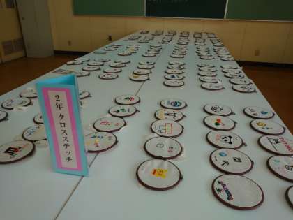 被服室には家庭科の授業で取り組んだ作品が並びます。1年生は刺し子刺繍、2年生はクロスステッチ、3年生は名前ワッペン。可愛らしい作品がいっぱいです。
