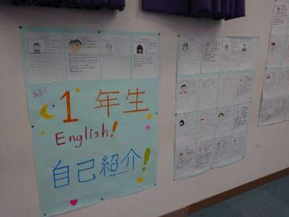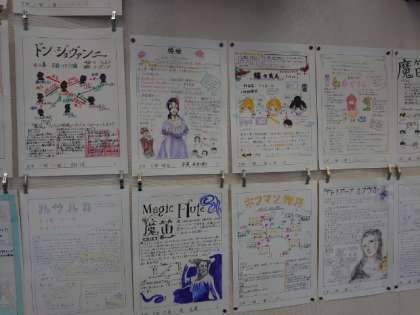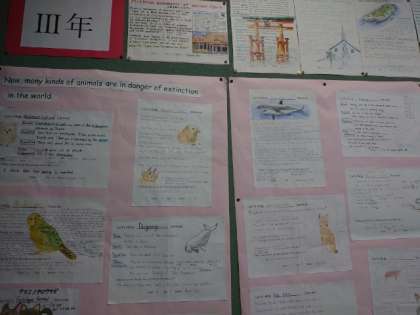 校舎2階のAL教室では英語科や音楽科のレポートが飾られています。自己紹介や、世界遺産・絶滅危惧種を英文で説明します。音楽は世界のオペラ作品を調べたようですね。