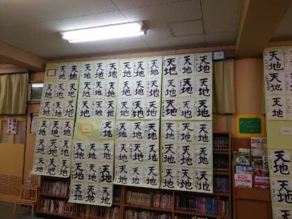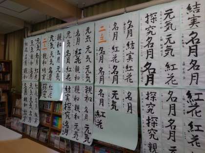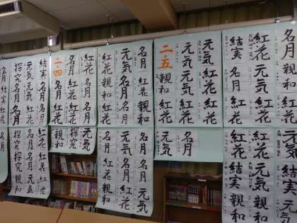 図書室には国語科の書写の授業で取り組んだ毛筆の作品がずらりと掲示されています。いろいろと書いた中から選んだお気に入りの作品です。