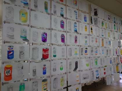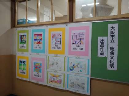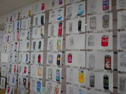 2年生の作品は美術の授業で取り組んだ空き缶を模写したもの。本物ソックリに描写するのが大変でした。色づかいも上手に出来ていますね。他、大阪市の総合文化祭に出品した作品もありました。