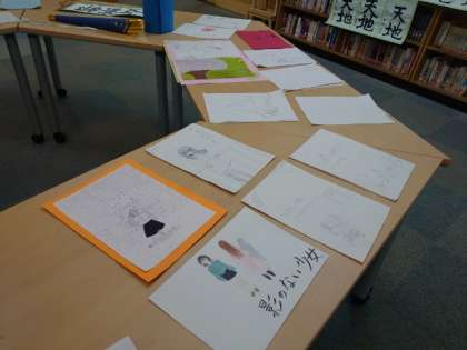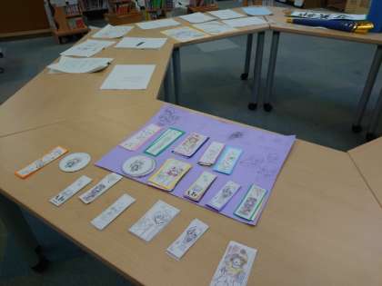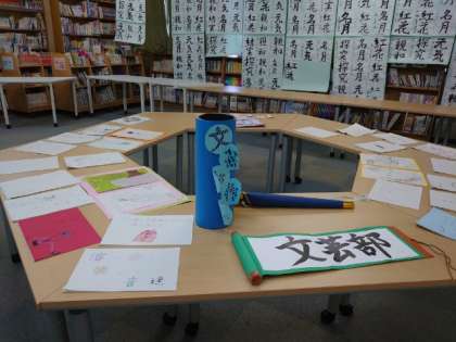 教科の作品に加え、文化系クラブの活動も紹介されています。文芸部では自作の小説やブックマークが展示されています。皆さん、いろいろな活動に取り組んでいますね。