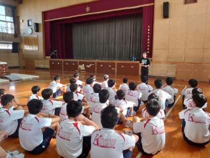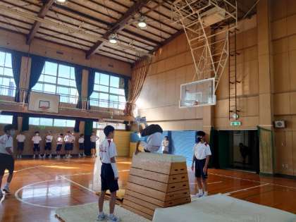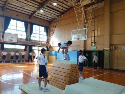 2年生男子体育で跳び箱の練習中。今日は実技テスト前の最後の練習です。5段から8段の跳び箱から跳びやすい高さを選んで、繰り返し練習します。跳ぶときの踏み切りや着手の位置を意識して、演技の精度を高めましょう。