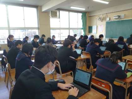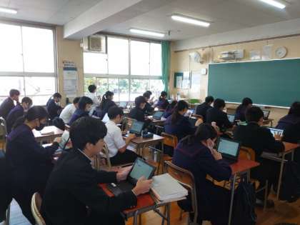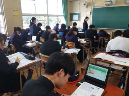 授業開始前の3年生教室では、タブレット端末を使って自学自習中。数学の問題が映し出され、皆さんすいすいと解き進めます。デジタル教材を活用した学習にも慣れた手つきで操作しているようです。