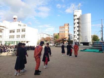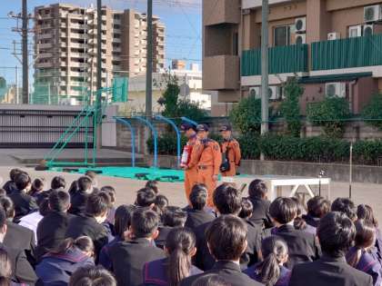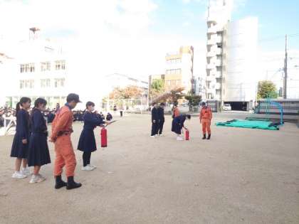 訓練の最後に、消防署の方から消火器の扱い方を教わりました。生徒会役員の皆さんが試しに練習してみます。学校内にも消火器を多数設置しているので、一度確かめてみましょう。