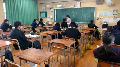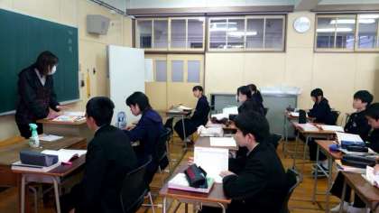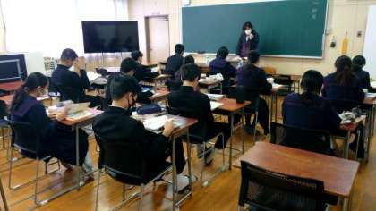 2年生国語科で少人数授業が行われています。文法の学習が得意・苦手の2グループに分かれて、習熟に応じた学習指導をすすめます。今日のテーマは「助詞」の使い方。わからない点はどしどし質問しましょう。