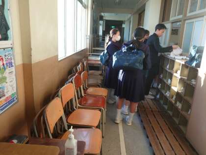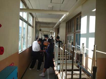 6時間目の授業が終わりました。3年生の皆さんが教室内の机やイスを廊下に運び出しています。学期に1度実施している教室のワックスがけ。教卓や給食配膳用のテーブルなども外に出します。ホームルームが終われば、ワックスがけが始まります。美しく磨き上げましょう。