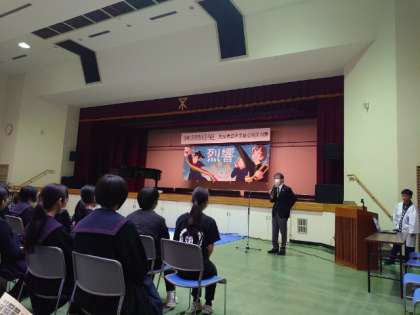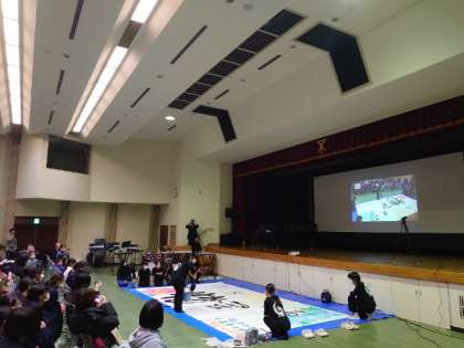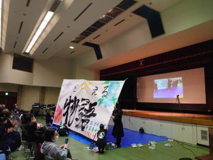 いよいよ合同文化祭が始まりました。加藤区長のご挨拶の後、夕陽丘中・高津中書道部の皆さんが一緒になって書道パフォーマンスを披露。学校を超えて互いに協力しあい作品を創造します。書道部の皆さんが気持ちを1つに頑張った素晴らしい発表でした。