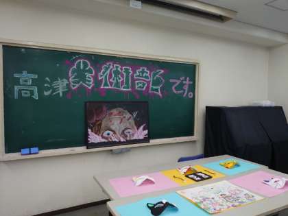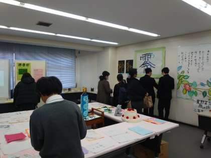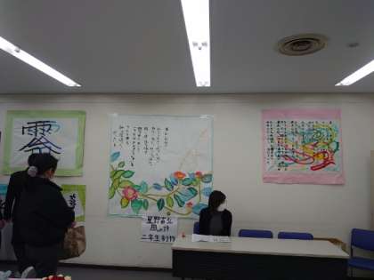 区民センター2階では、中学校毎に作品展示が行われています。高津中のお部屋には文化部の皆さんの作品がずらりと並びます。他校の生徒さんもたくさん鑑賞していましたね。