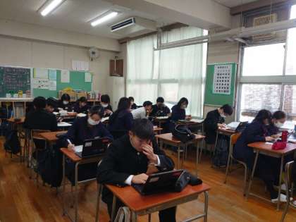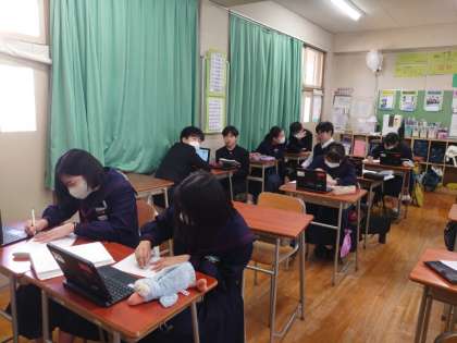 3年生理科の授業で「自然環境の調査」について学習します。植物や水辺の生き物、魚や鳥の生態など調査対象は多岐に渡ります。皆さん何を調べたいか、タ ブレット端末を使って検索中。興味を引くテーマが見つかりましたか?