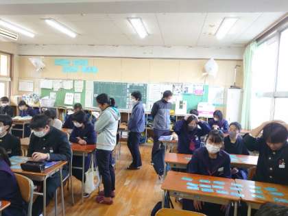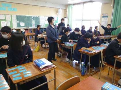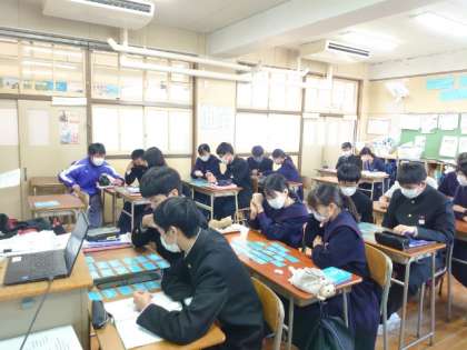 3年生英語科で「仮定法」の復習中。今日はゲーム形式でおさらいします。各ペアに仮定法の英文カードが配られました。先生から英文が示され、(カルタの要領で)関連するカードをゲットします。皆さん何枚獲得できましたか?