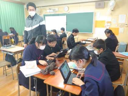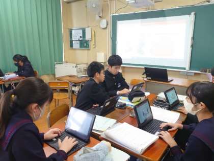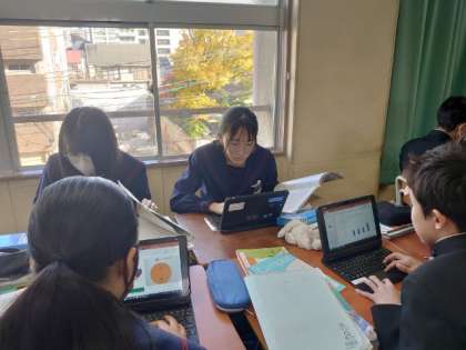2年生英語の授業で取り組んでいるアンケート調査。クラスメイトにいろんな質問を英語で行います。好きな果物やスポーツ、教科などグループ毎に質問項目を考えました。アンケート結果をタブレット端末を使ってグラフ化し、英語で発表するそうです。どんな結果になったでしょうね?