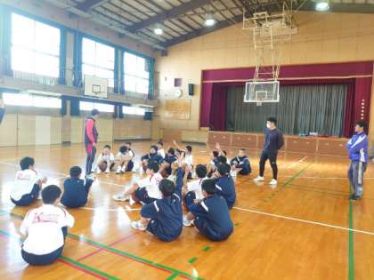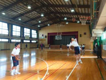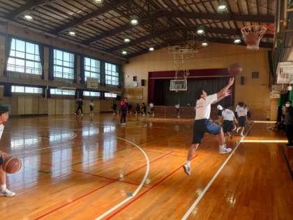 1年生男子体育でバスケットボールの練習中。体育館にある6つのゴールを順に巡りながらシュートを決めます。レイアップシュートやジャンプシュートを試みますが、コツを掴むのがけっこう難しいですね。