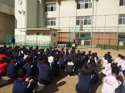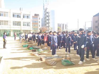 年に1度、校区の公園を清掃する「ふれあい清掃」。1、2年生が運動場に集まってきました。先生からの諸注意の後、校区内にある7つの公園に出かけます。お天気は雲一つない快晴。絶好のお掃除日和です。