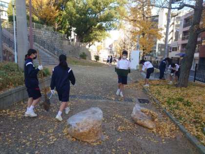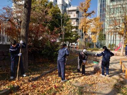 各公園でお掃除がスタートしました。先生から清掃場所や手順についてお話を聞き、協力して取りかかります。落ち葉をいっぱいかき集め、ゴミ袋に詰めていきます。皆さん、熱心に活動しています。