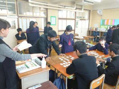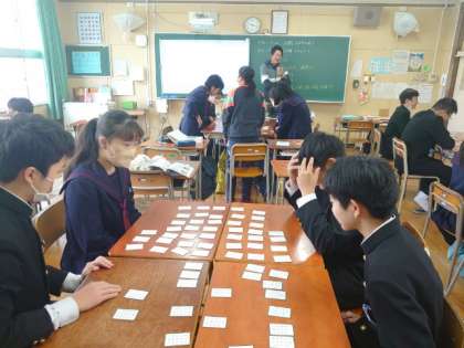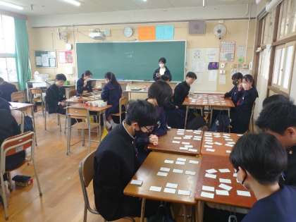 2年生の各教室で百人一首を楽しんでいます。来年行われるクラス対抗戦に向けた練習とのこと。先生が上の句を読み上げると、皆さん一斉に取り札を探します。年末年始恒例の取り組みに、お正月気分を感じます。