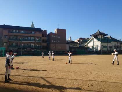 冬休みも残りわずかになりました。今日から活動を再開するクラブが練習に励んでいます。現在、運動場では野球部が活動しています。キャッチボールにトスバッティングと、徐々に身体を目覚めさせているようです。