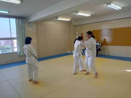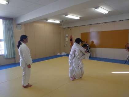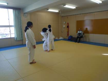 武道場では、柔道部が新年の初稽古を行っています。ケガ防止のため、いつもより入念に身体をほぐした後、打ち込みの稽古が始まりました。相手を投げるまでの動作を繰り返し練習します。打ち込み練習は柔道の基礎・基本とのこと。技に入るタイミングを確かめましょう。