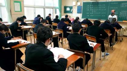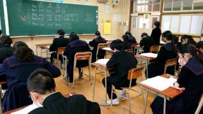 大阪府内の公立中学校を対象に実施する「中学生チャレンジテスト」。1年生の皆さんが問題を解いています。午前は国・数・英の3教科、午後は「大阪市版チャレンジテスト plus」として、社・理のテストに挑戦します。冬休み明け早々のテストですが、ベストを尽くしましょう。